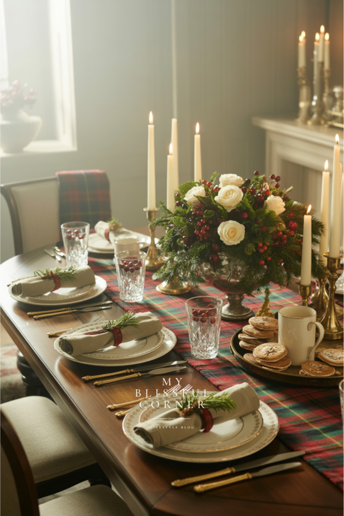 When I think of the holidays, I picture tartan ribbons, deep red velvet bows, brass accents, and flickering candlelight.